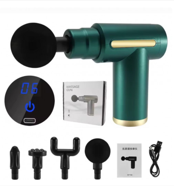 Pistola de Masajes con 4 cabezales intercambiables + 6 niveles de intensidad. Ideal para deportistas, oficina y uso diario.